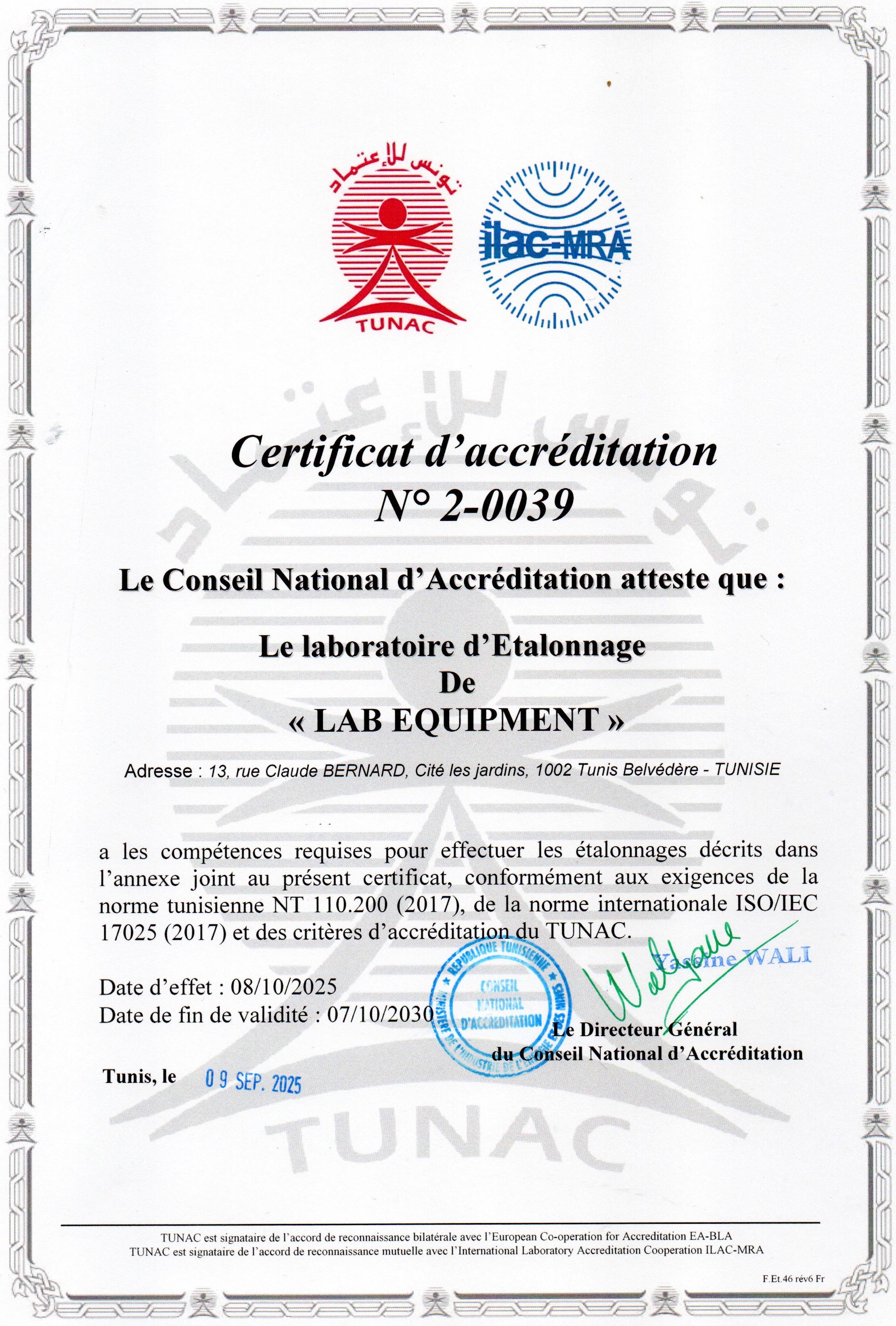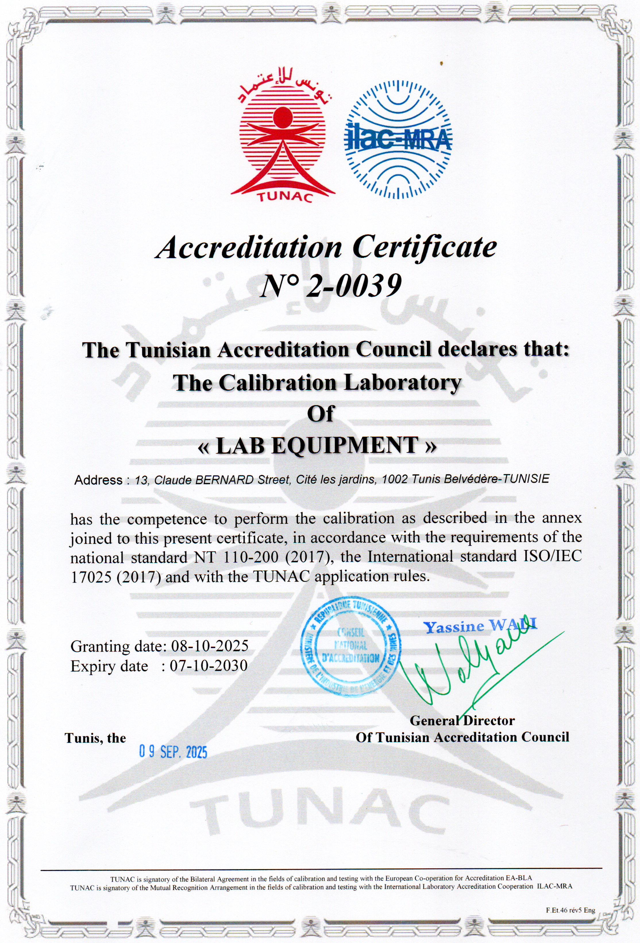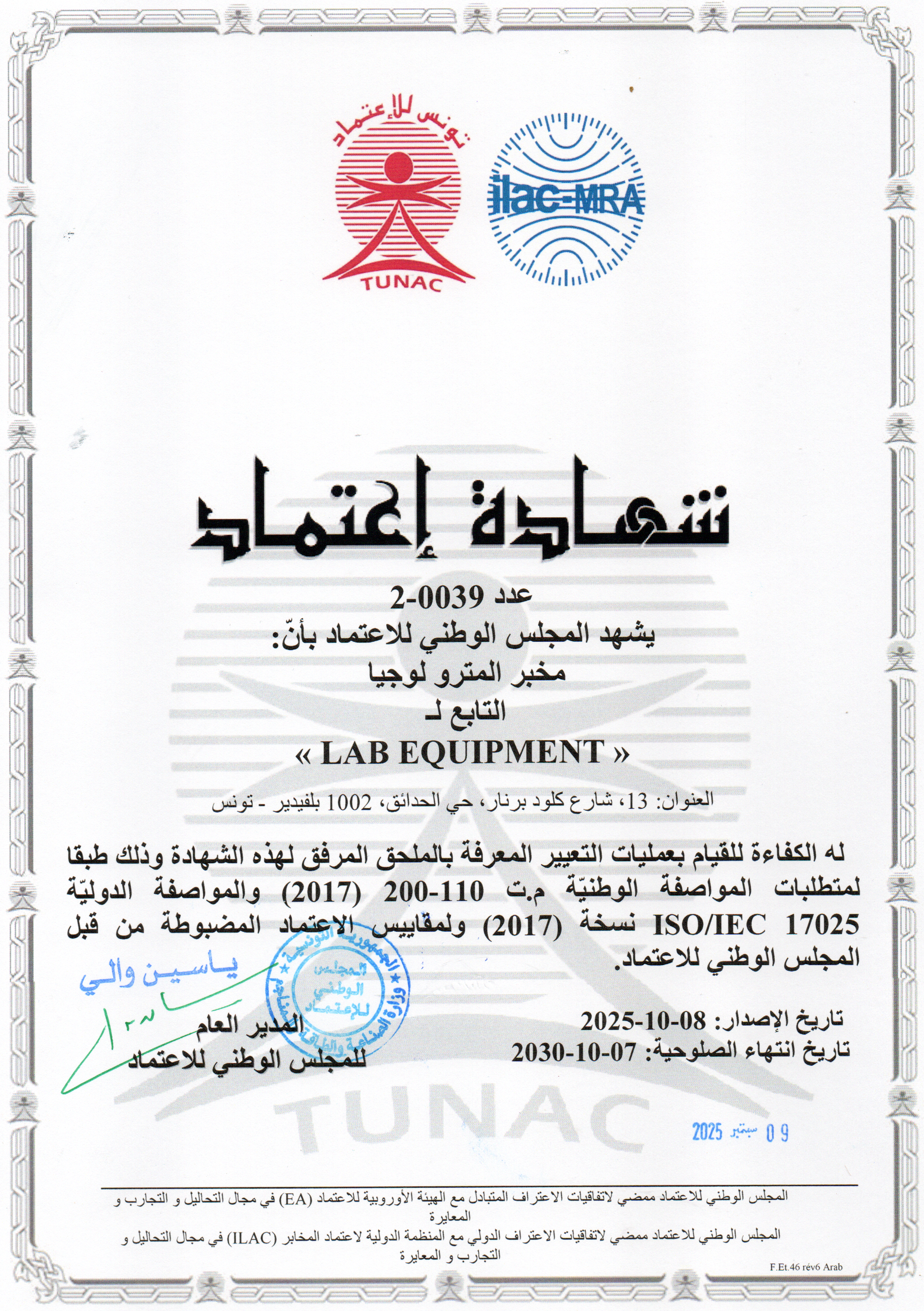 Les laboratoires de lab-equipment sont accrédités en Tunisie , par le Conseil National d’Accréditation TUNAC dont ci-joint nos diplômes d'accréditations :